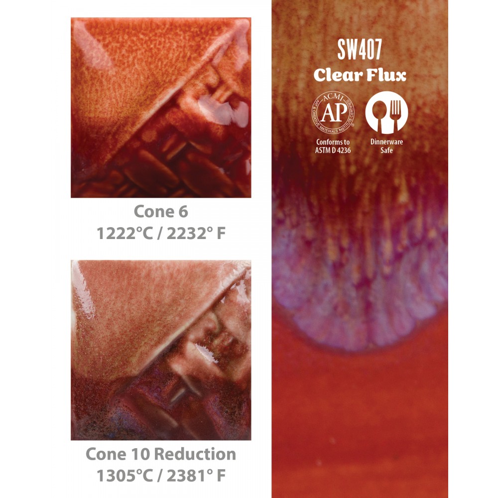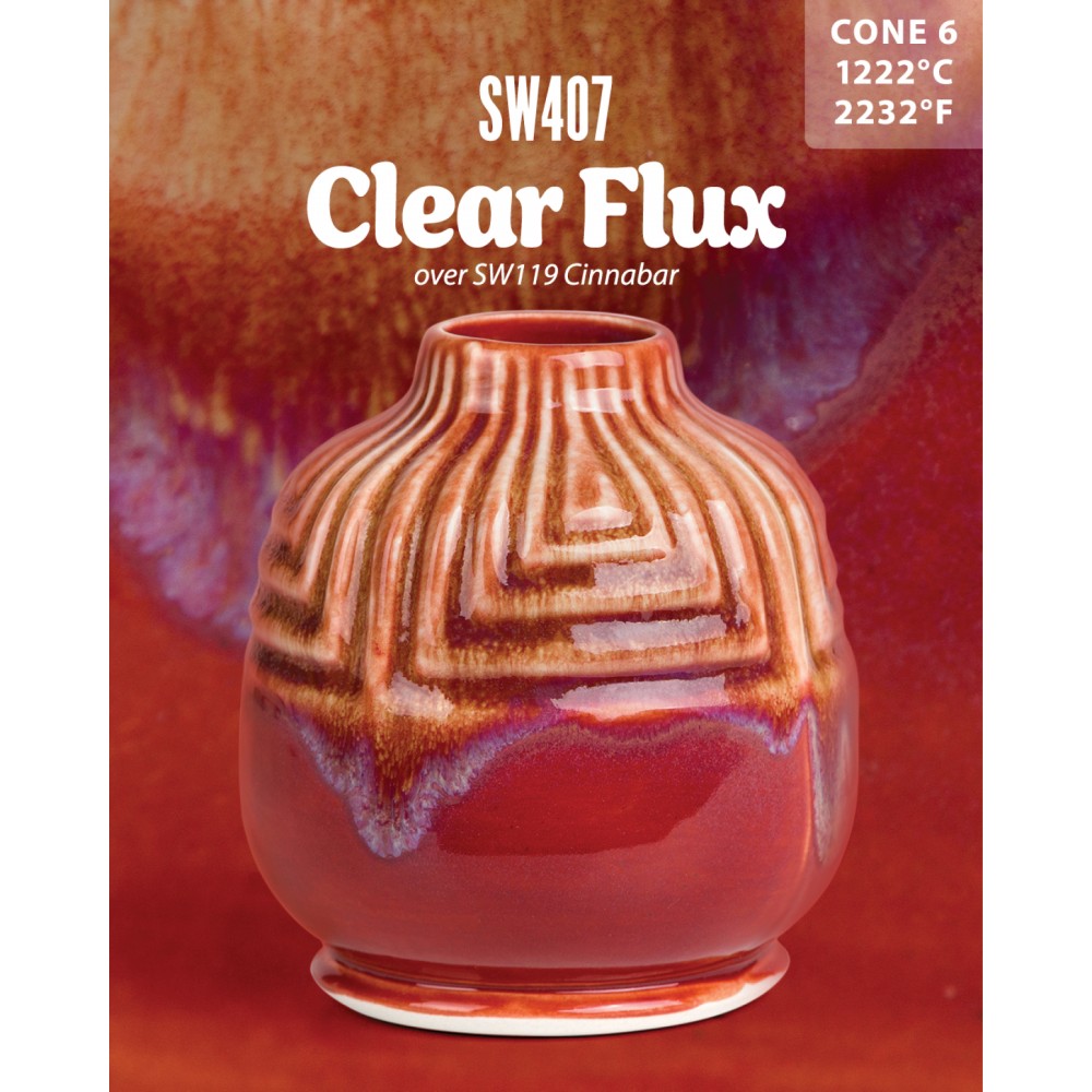 Clear Flux is a mid-range glaze that was developed to be used in combination with other mid-range glazes to produce flowing effects. CLear Flux interacts with other glazes to create movement, bringing about "hidden" colors and visual texture. The order in which you apply Clear Flux - above or beneath another glaze - impacts the fired result. Designed to fire to cone 5/6 but can be fired to cone 9/10 (movement will be more pronounced at higher temperatures).