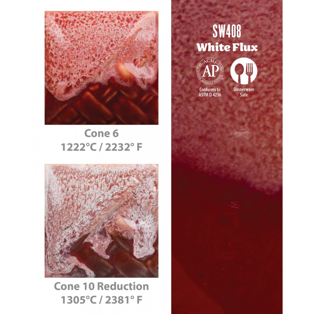 White Flux is a mid-range glaze that was developed to be used in combination with other mid-range glazes to produce flowing effects. White Flux interacts with other glazes to create movement, bringing about "hidden" colors and visual texture. The order in which you apply White Flux - above or beneath another glaze - impacts the fired result. Designed to fire to cone 5/6 but can be fired to cone 9/10 (movement will be more pronounced at higher temperatures).